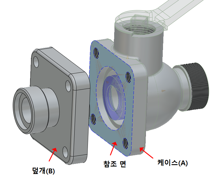 인컨텍스트 설계는 바텀업처럼 개별 부품으로 존재하지만, 탑다운처럼 상호 관계를 가지며 설계되는 하이브리드 방식을 의미하는데요. 어셈블리 환경 안에서 주변 부품의 형상을 직접 참조하여 새로운 부품을 만드는 것이죠. 예를 들어, 케이스(A)의 면을 그대로 참조해 덮개(B)의 돌출에 사용하면, 두 부품은 독립적인 파일로 존재하면서도(바텀업의 장점) 케이스의 홀 위치, 필렛 등 외형이 바뀌면 덮개의 외형도 자동으로 따라 변경되는(탑다운의 장점) 지능적인 관계를 갖게 됩니다.