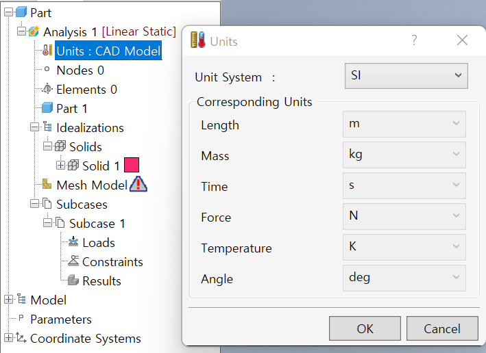 – Inventor Nastran 환경 단위계 변경: 트리에서 Units를 더블클릭하고 meter와 kilogram으로 설정된 단위계를 선택합니다.